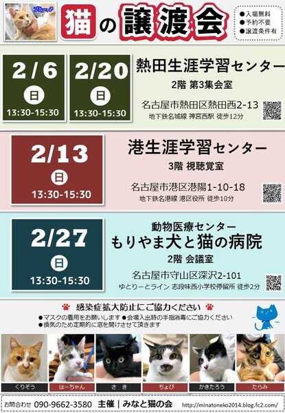 | イベント内容 | =みなと猫の会 第319回譲渡会のお知らせ== ずっとのお家を探し中の保護猫たちがたくさんやってきます ◆ペットショップへ行く前にぜひ譲渡会へ◆ 完全室内暮らしのトレーニングを済ませた猫たち25~30匹ほどが参加予定です ○主 催 みなと猫の会 ○日 時 2022年2月13日(日) 13:30~15:30 ○場 所 港生涯学習センター 3階 視聴覚室 名古屋市港区港陽町1丁目10-18 地下鉄名港線「港区役所」駅徒歩11分 ※建物裏に専用駐車場有(利用料:300円/日) https://goo.gl/maps/sLfav8emZ5p ※お問い合わせは会場ではなく minatonekonokai@gmail.comもしくは 090-9662-3580 まで ○参加猫について ・参加している猫は、ワクチンや駆虫等の基本治療を済ませています。 また、年齢に応じて避妊去勢手術を行っています。 ・参加予定猫が体調不良などで急遽不参加になることもあります。 ○参加猫一覧 http://minatoneko2014.blog.fc2.com/blog-entry-1624.html ○ご来場の皆様へ ・譲渡会の見学は入場無料・予約不要です。 ・当日に猫をお渡しすることはありません。 後日ご自宅までお届けに伺います。 ・一週間から二週間のトライアル期間後、正式譲渡となります。 ・トライアル及び譲渡の際には 完全室内飼い・ご家族の同意・脱走防止策・ アンケート記入など諸条件がございます。 ・里親様には治療費の一部ご負担をお願いしております。 これ以上不幸な猫を増やさないための 治療費とさせて頂きますので何卒ご理解ください。 ・非会員の個人保護者も参加しています。 譲渡条件やトライアルは猫の保護者に準じます。 ・譲渡会の流れ http://minatoneko2014.blog.fc2.com/blog-entry-11.html ○猫に関する相談も受け付けています ねこについての困りごと、トラブルなどを抱えている方、 相談へいらっしゃいませんか。 ○次回以降の譲渡会予定 日時:2022年2月20日(日) 13:30-15:30 場所:熱田生涯学習センター 2階 第3集会室 名古屋市熱田区熱田西町2-13 地下鉄名城線地下鉄「神宮西」駅より徒歩12分 日時:2022年2月27日(日) 13:30-15:30 場所:動物医療センター もりやま犬と猫の病院 新館2階 会議室 愛知県名古屋市守山区深沢2-101 ゆとりーとライン「志段味西小学校」バス停留所 徒歩2分 日時:2022年3月6日(日) 13:30-15:30 場所:港生涯学習センター 3階 視聴覚室 名古屋市港区港陽1-10-18 地下鉄名港線「港区役所」駅より徒歩10分 日時:2022年3月13日(日) 13:30-15:30 場所:熱田生涯学習センター 2階 第3集会室 名古屋市熱田区熱田西町2-13 地下鉄名城線地下鉄「神宮西」駅より徒歩12分 日時:2022年3月19日(土) 13:30-15:30 場所:港生涯学習センター 3階 視聴覚室 名古屋市港区港陽1-10-18 地下鉄名港線「港区役所」駅より徒歩10分 日時:2022年3月27日(日) 13:30-15:30 場所:動物医療センター もりやま犬と猫の病院 新館2階 会議室 愛知県名古屋市守山区深沢2-101 ゆとりーとライン「志段味西小学校」バス停留所 徒歩2分 ◎主催者ブログ みなと猫の会 ~こぴっと猫だより~ http://minatoneko2014.blog.fc2.com/ ■ブログに会ってみたい猫がいた!でも参加予定猫に入ってない、 どうすればいいの? ■譲渡会当日は都合が悪くて… それ以外の日に猫とお見合いがしたい! などのお問い合わせは minatonekonokai@gmail.com まで 〇感染症の拡大防止にご協力願います ・会場入出時の手の消毒にご協力ください ・定期的に換気作業を行います ・マスク等の使用をお願いします 写真1枚目 ハッピー ♀ 2才くらい 控えめで温厚です ちょっぴりビビりさん 写真2枚目 柿太郎(かきたろう) ♂ 7ヶ月半 人馴れバツグン!抱っこやナデナデが大好きです ☆★個性豊かな猫たちが皆様をお迎えします★☆ 猫とスタッフ一同、お待ちしております |