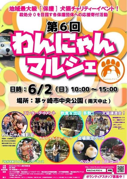 | イベント内容 | ■第6回わんにゃんマルシェ 譲渡会 日程:6月2日(日) 時間:10:00~15:00 場所:茅ヶ崎市中央公園 (神奈川県茅ヶ崎市茅ヶ崎2-3-1) 保護犬と触れ合える譲渡会他、無添加手作りジャーキー、オリジナルグッズ、ドッグウェアなどのワンコグッズの販売をいたします。 FB⇒ https://www.facebook.com/wannyanmarche/ |