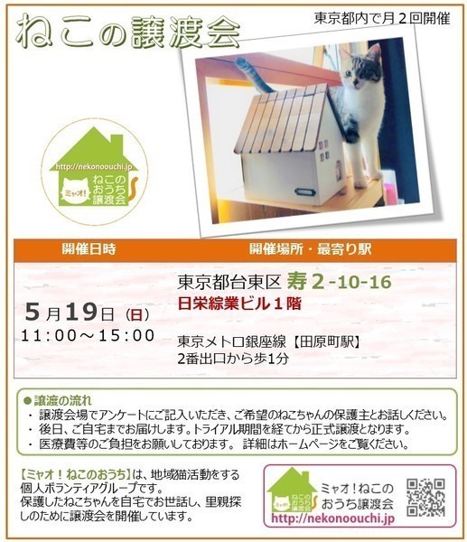 | イベント内容 | 参加する保護猫ちゃんについては、譲渡会一週間前からホームページhttp://nekonoouchi.jp/にてご紹介しております。 事前予約はできません。譲渡会場でお会いしましょう。 ※お問い合わせはホームページ内の【お問い合わせ】からお願い致します。保護主は日々、猫ちゃんのお世話と仕事に忙しくしておりますので、お返事に数日頂くこともございます。ご了承ください。 譲渡会場では、入口で簡単なアンケートにお答えいただきます。 気になる猫ちゃんがいたらスタッフにお声がけください。 面談後、双方に不安がないようでしたら、トライアル開始日をご相談させていただきます。 譲渡会当日に猫ちゃんを連れて帰ることはできません。 トライアル開始日にご自宅にお届けします。 トライアル期間を経て問題がないようでしたら、譲渡成立となります。 詳細は、ホームページ【譲渡の流れ】ページでご確認いただけます。 ◇譲渡に関するお願い 【ミャオ!ねこのおうち譲渡会】では、以下のお約束をお願いしております。 ・完全室内飼いで終生愛育 ・脱走させないための対策 ・不妊去勢手術 ・譲渡誓約書の取り交わし ・医療費の一部ご負担 ・記念の写真撮影 ・原則として、譲渡時に60歳未満の方 その他、ひとり住まいで緊急時の対応に困難な方や、経済的に困難な世帯、必要な脱走対策を施していただけない場合はご遠慮頂いております。 また、保護主により譲渡条件が異なる場合もございますので、会場で十分にご相談ください。 譲渡までの流れ、譲渡時のお願い、医療費の一部ご負担などは、ホームページでご確認いただけます。 ※お問い合わせは、ホームページ内の【お問い合わせ】からお願い致します。お返事に数日頂くこともございますが、ご了承ください。 |