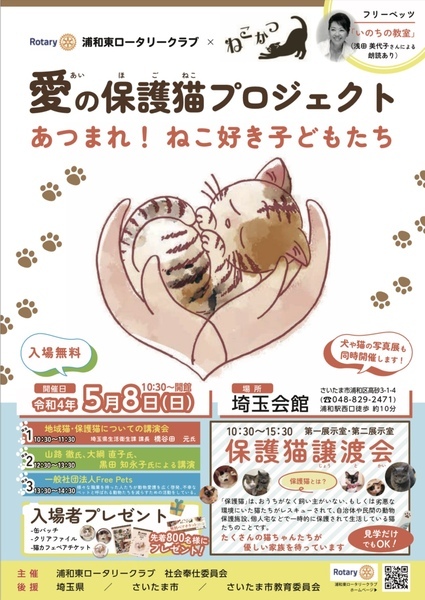 | イベント内容 | 浦和東ロータリークラブさま主催のイベント内で開催される保護猫譲渡会に参加します。 子猫から成猫まで沢山の猫達が参加予定です。 ◎場所 埼玉会館(浦和駅西口徒歩約10分) 第一展示室、第二展示室 ◎入場料 無料✨ ★ワンちゃんネコちゃんの写真展も同時開催★ ★先着で入場者プレゼントも★ たくさんの方のご来場、お待ちしてます! |