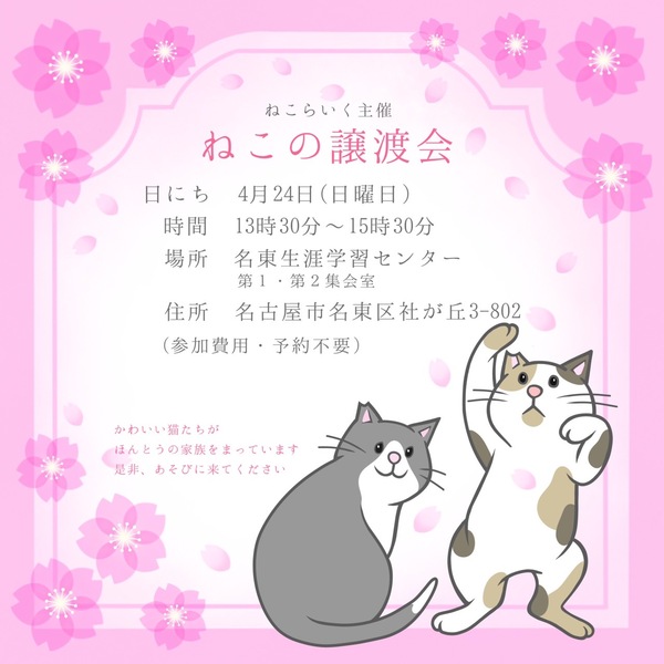 | イベント内容 | 「猫の譲渡会」 日にち:2022年4月24日(日) 時間 :午後1時30分~3時30分 会場 :名東生涯学習センター 第1.2集会室 名古屋市名東区社が丘3-802 予約・入場料不要です *駐車場有(300円/日) 満車の場合は猪高緑地公園駐車場(無料)も ご利用になれます 近隣にコインパーキングがあります 主催:ねこらいくnenet https://nekonetwork.com/ 募集猫中の猫は https://nekolike.amebaownd.com/ ―------- 上記ブログで紹介しています 猫の急な体調変化により参加できない 場合もあります。 ご了承いただきますようお願いします。 実際に猫を見てから考えたい 飼育の仕方について質問したい・・・など すぐに決められない方でも結構です ぜひ、譲渡会におこしください 〇室内飼い、家族全員の同意、治療費の負担など お願いごとがあります 〇1~2週間のお試し飼育期間があります 〇当日、猫を連れて帰ることはできません *感染症対策を実施しています ・会場入出時の手の消毒、検温にご協力ください ・常時、窓を開け換気をしています ・スタッフはマスクを着用し、ご入場の方にもマ スクの着用をお願いしています ・室内への入場は一定の人数とさせていただきます |