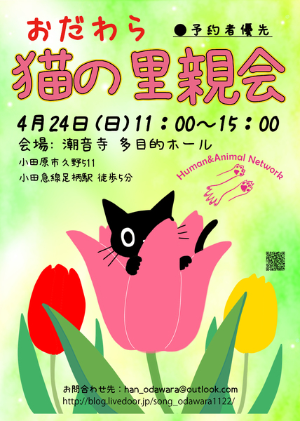 | イベント内容 | ※コロナ感染予防のマナーにご協力ください※ ◆来場人数に制限をしますのでご理解ください ◆なるべく多くの方がご来場できるよう少人数でお越しください(1家族2名が理想) ◆事前予約の方が優先入場となります。 下記の「事前予約の方法」をお読みください ◆1家族の割り当ては最大1時間です(お見合い30分、面談30分) ※詳細はブログにて http://blog.livedoor.jp/song_odawara1122/archives/59181419.html 日時:2022年4月24日(日)11:00~15:00 会場:潮音寺 多目的ホール 神奈川県小田原市久野511 小田急線足柄駅より徒歩6分 駐車場有(無料) 【交通案内】 新宿方面から 小田急線足柄駅 横浜方面から JR東海道線:小田原駅 → 小田急線:足柄駅 ※注意※ ナビ検索では 小田原市久野507(潤生園やすらぎの家足柄)で 検索してください。 小田原市久野511 で検索すると迷子になります! □■□事前予約の方法■□■ 事前予約はメールにて受付けております メールアドレス:han_odawara@outlook.com ①ご応募の前に里親さんになるための条件を確認してください。 ②ご応募の際は以下6点を必ずご明記ください。 ●ご氏名 ●電話番号 ●最寄り駅 ●家族構成(年齢含む) ●先住ペットの有無 ●お見合いを希望する猫の名前 ③後日メール受付担当より当日の面談時間についてご連絡をいたします。 □■□里親さんになるための条件■□■ 1.終生愛情をもって飼育すること 2.完全室内飼い必須 3.ペット飼育可物件であること 4.脱走防止&名札の装着を徹底できること 5.猫を迎える事に家族全員の同意があること 6.譲渡後の定期報告ができること 7.ご家族に猫アレルギーの方がいないこと 8.単身者のご応募は保証人(非常時に飼育対応をしてくれる人)が居ること 9.ワクチン接種と傷病時の適切な治療ができること 10.万が一 猫が脱走した場合は適切な対応ができること 11.医療費と譲渡時の交通費を負担して頂けること 12.ペットを飼育できる十分な収入と時間があること 13.身分証明を提示できること 14.自宅への訪問が可能であること 15.譲渡誓約書の内容を十分理解し、譲渡後も誓約内容を継続的に守って頂けること 16.譲渡が決定した場合、譲受者一部負担金にご協力頂けること |