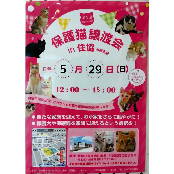 | イベント内容 | 毎月1回、保護猫カフェ「ねこかつ」主催の譲渡会を開催しています。 子猫から成猫まで沢山の猫達が参加予定です。 【注意事項】 ・マスク着用、アルコール消毒のご協力をお願いいたします。 ・雨天の場合は室内に変更となります。 ・お車でお越しの場合は近隣のコインパーキングをご利用下さい。 たくさんの素敵なご縁がありますように♪ |