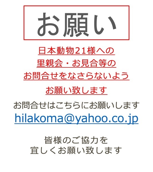 | イベント内容 | 東京 錦糸町の専門学校日本動物21様のご協力により、同校舎にて猫の里親譲渡会を開催させていただきます。 〘 お願い 〙 日本動物21様は譲渡会の会場をお貸して頂いているだけですので、里親会・お見合い等に関する一切の問い合わせは受け付けておりません。 ※日本動物21様への電話での問合せはご遠慮ください。 里親会・お見合い・譲渡・掲載している猫等など、全てのお問合せは当会までお願い致します。 hilakoma@yahoo.co.jp 参加猫さんはこちらからご覧下さい。(随時更新) https://www.pet-home.jp/member/user360938/post/ https://omusubi-pet.com/groups/193 ●日時:8月7日(日) 12:00~16:00 (入場受付11:30 最終受付15:00) ●会場:専門学校 日本動物21 墨田区錦糸1-11-10 4F ●アクセス:JR総武線・総武快速線「錦糸町駅」 北口徒歩6分/東京メトロ半蔵門線「錦糸町駅」 3出口徒歩6分 ※東京都墨田区錦糸1-2-1(アルカタワーズ)は同校の法人本部です。 里親譲渡会の会場ではございませんので、お間違いのないよう御願い致します。 感染対策として、ご来場の際は「マスク着用」「入り口でのアルコール消毒」「検温・アンケート・問診票の記入」のご協力をお願いしております。 『三密』を避けるため、以下のように対応させていただきます。 *会場入場者数を制限する場合がございます *窓を開けての外気換気を行いますので、猫さんをケージの外に出すことはできません *会場には待機場所のご用意はございません ご理解いただきますよう、お願いいたします。 子猫ちゃんたちも参加予定なので、小さい頃から一緒に暮らしたい、育てたいとお考えの方、ぜひお越しください! 男性の一人暮らしの方やご高齢の方にもぴったりの、まったりした大人猫さんたちも参加予定です。 里親希望の皆さま、ぜひ、足をお運びください! 猫さんの状況により、当日不参加になる場合があります。 当日ご希望の猫さんを連れて帰ることはできません。 トライアル決定後、後日ご自宅までの送り届けとなります。 ☆譲渡には当会における一定の条件があります。 ☆当会および里親譲渡会についてのお問い合わせ ☆外猫、保護猫のために物資のご支援を頂ける方がおりましたら、送付先をご連絡させていただきますので、ご連絡下さい。 ☆預かりボランティアさん、活動のお手伝いをして頂ける方も随時募集中です。 hilakoma@yahoo.co.jp 当会ブログ https://ameblo.jp/hirakomashippo/ インスタグラム、更新中です https://www.instagram.com/hirakomashippo Twitterやってます〜!! https://twitter.com/hirakomashippo |