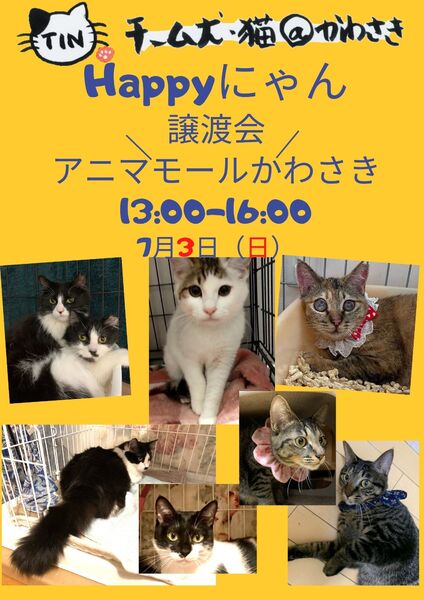 | イベント内容 | チーム犬・猫@かわさき 今回は、川崎市動物愛護センター(アニマモールかわさき)にて譲渡会開催します。 この機会にぜひアニマモールへ足を運んでみてください! ※ポスターの子たちは現在当会で家族募集中の猫さんたちですが、今回の譲渡会に参加するか否かはまだ決まっていません。 当日参加する予定の猫達や募集中の猫さん達についてや、 譲渡条件や譲渡の流れなどの詳細は ホームページ https://aipet.blog.jp/ インスタグラム https://www.instagram.com/team.inuneko.kawasaki/ ツイッター https://twitter.com/team12kwsk フェイスブック https://www.facebook.com/%E3%83%81%E3%83%BC%E3%83%A0%E7%8A%AC%E7%8C%AB%E3%81%8B%E3%82%8F%E3%81%95%E3%81%8D-101251259259132 をご確認ください。 |