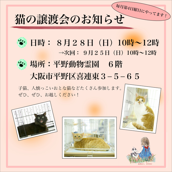| イベント内容 | 8月28日(日)に大阪市で猫の譲渡会を開催します! 今まで過酷なお外で耐えてきた人懐っこい猫ちゃんをあなたのお家で癒してあげてほしいです。 子猫、おとな猫などたくさんの猫ちゃん達が参加します。 涼しくて広い部屋で、気になる猫ちゃんとゆったりとお過ごしください。 日時:2022年8月28日(日) 10:00〜12:00 →毎月第4日曜日にやってます。次回は9月25日(日)です。 場所:平野動物霊園 6階 住所:大阪市平野区喜連東3−5−65 ※施設の駐車場は使えません。近隣の有料駐車場をお使いいただければと思います。 有料駐車場は1F受付で案内いたします。 →電車でお越しの場合 Oaka Metro谷町線「喜連瓜破」駅、3番出口を出て東(左)に徒歩9分。 Oaka Metro谷町線「出戸」駅、1番出口を出て西(左)徒歩7分。 →バスでお越しの場合 「Oaka Metro長居」発「出戸バスターミナル」行き乗車「喜連住宅前」下車、 西へ徒歩5分(左)徒歩7分。 →車でお越しの場合 阪神高速14号松原線「喜連瓜破」出口より長居公園通東へ約2分。 |