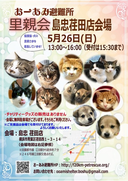 | イベント内容 | 可愛い仔犬や仔猫、成猫がたくさん出場しますよ! 当日にはご来場できないかたも、ぜひお問い合わせください。 別日にお見合いの設定も可能です。 どうぞ、よろしくお願いします。 ☆★☆★☆★☆★☆★☆★☆★☆★☆★☆★☆★☆★☆★☆★☆★☆★☆★☆★☆ ~5月26日(日)荏田にて里親会開催!~ ◎場所・・「島忠 荏田店」 横浜市青葉区荏田西1-3-14 東急田園都市線「江田」駅より徒歩7分 246号線江田駅交差点そば ◎日程・・5月26日(日)(雨天決行) ◎時間・・13時から16時(受付は15時30分まで) (会場に無料駐車場がございます) ■里親ご希望の方にはアンケートを記入して頂きます。 ■下記リンクより事前にアンケートをご記入いただくと、待ち時間が短縮されます。 ★ 猫ご希望のかた向けアンケート https://goo.gl/ZNRFtI ★ 犬ご希望のかた向けアンケート https://goo.gl/pwWUMj ■アンケートで頂戴した個人情報は適切に管理し、里親さま決定のための資料としてのみ使用いたします。 ■アンケートをご提出いただいても、譲渡をお約束するものではないことをご承知置きください。 ※参加予定の猫は体調により参加できない場合があります。ご了承ください。 ※詳細はお問い合わせいただくか、ブログ・HPをご覧くださいませ。 おーあみ避難所ブログ:http://ameblo.jp/oami-hinanjyo おーあみ避難所HP:http://www.geocities.jp/oami_hinanjyo/ ☆★☆★☆★☆★☆★☆★☆★☆★☆★☆★☆★☆★☆★☆★☆★☆★☆★☆★☆ |