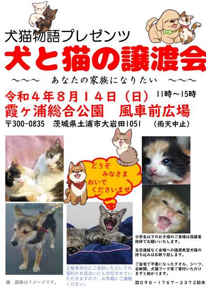 | イベント内容 | 犬と猫の譲渡会です。 茨城県土浦市の霞ヶ浦総合公園の風車前広場にて開催。 あなたとの出会いを待つ可愛いわんにゃんに会いにきてくださいませ。 犬猫を連れて帰ることはできません。 保護主さんとお話をしていただき、お互い条件が合えば後日のお届けとなります。 |