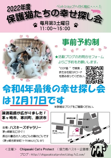 | イベント内容 | 茅ヶ崎産まれ、茅ヶ崎育ちの猫たちが新しい家族とのご縁を待っています。 譲渡範囲が広がりました→茅ヶ崎市、藤沢市、寒川町 詳しくは活動ブログをご確認ください。 http://chigasakicatprotect.blog.fc2.com/blog-entry-2127.html 予めメールにてアンケートを送っていただき ご予約を取っていただくという流れを取っております。 万が一のことがあってはいけないので ご面倒をおかけいたしますが どの子にするか決まっていない方も 予めアンケートを添えてご予約のお問合せをお願い致します。 譲渡条件をご確認のうえ、 ご理解いただけた場合のみアンケートを添えてメールを送ってください。 ※先住猫さんが居る場合は必ず 猫コロナ抗体価検査を実施していただきますようお願い致します。 猫コロナ抗体価実施についてはこちらの記事をご覧ください。 http://chigasakicatprotect.blog.fc2.com/blog-entry-2350.html 予約時間は11時~15時までの間で ①11時~2枠 ②12時~2枠 ③13時~2枠 ①~③までの時間帯でのご予約をお願い致します。 それぞれ1時間しっかり見ていただける時間がございますので 里親希望者様はお問合せフォームから事前予約をしたうえでご希望の時間をご記入の上、指定時間にご来場ください♪ ※アンケートを添えてお問合せをお願い致します※ ※事前予約の無い方は入場できません。ご了承ください。 ※マスク必須(マスクをお持ちでない方は当会にて販売している手作りマスクを購入していただきます) ※入場時、CCP里親希望者用アンケートへのご記入にご協力ください ◆当日猫用品等のフリマも同時開催!! |