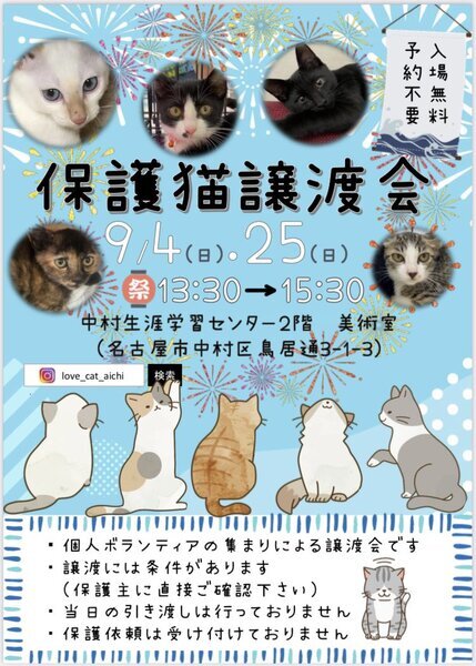 | イベント内容 | 2階美術室にて 個人ボランティアの集まりによる猫の譲渡会です。 子猫20頭ほどと成猫が参加します。 よろしければ会いに来てやってください。 譲渡にはペット飼育可能のお住まいである等の条件があります。 当日のお渡しはしていません(お届けのみになります) 引き取りはできません。 ご相談等は混雑状況により後日改めてということになるかもしれませんが ご了承ください。 |