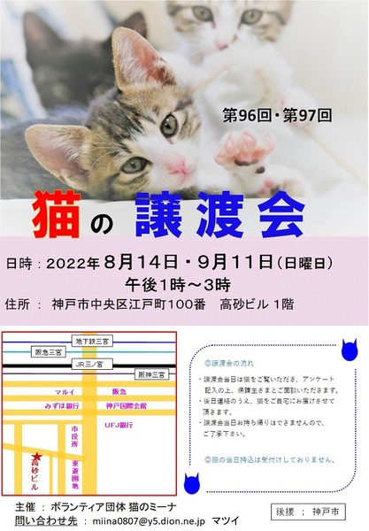| イベント内容 | 今回は仔猫も大人猫も参加予定です。 保護された猫たちが参加して、新しいお家を求めて参加します(=^・^=) 猫は後日こちらからお届けをさせて頂き、お家の環境を見せて頂ければと思います。 猫は20年くらい生きる子もいますので、ご自身の年齢に合った猫さんとの出会いを探しに来てください。 ペット不可にお住まいの方はご遠慮ください! 譲渡には条件が多数ありますので、ご理解くださいませ<m(__)m>。 まずはお試しで猫との相性を見てから、正式譲渡となります。 また、猫を参加させたい方も、募集していますのでお申し込みくださいね! アドレス miina0807@y5.dion.ne.jp にご連絡をください。 お越しの際は各路線の三宮駅からは徒歩10分くらい、車でお越しの場合は近隣のコインパーキングなどにお停めください。 当日、体調の悪い方、発熱がある方、このような方はご遠慮ください。 こちらでは、体温チェックや消毒をし、万全を期しております。 密にならないように、人数制限をしておりますので、お待ち頂く場合があります。 ブログ: 猫のミーナといっしょ http://miina300.blog.fc2.com/ ねこのオカン |