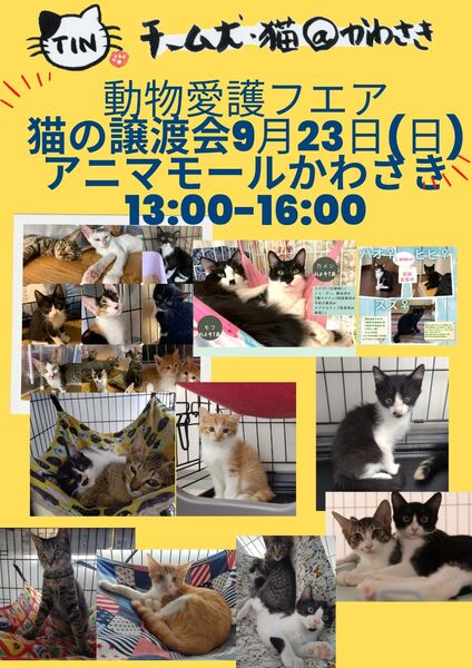 | イベント内容 | チーム犬・猫@かわさき 今回は、川崎市動物愛護センター(アニマモールかわさき)にて行われる愛護フェア内で パウパッズさんと共同で譲渡会開催します。 この機会にぜひアニマモールへ足を運んでみてください! ※ポスターの子たちは現在当会で家族募集中の猫さんたちですが、今回の譲渡会に参加するか否かはまだ決まっていません。 当日参加する予定の猫達や募集中の猫さん達についてや、 譲渡条件や譲渡の流れなどの詳細は ホームページ https://aipet.blog.jp/ インスタグラム https://www.instagram.com/team.inuneko.kawasaki/ ツイッター https://twitter.com/team12kwsk フェイスブック https://www.facebook.com/%E3%83%81%E3%83%BC%E3%83%A0%E7%8A%AC%E7%8C%AB%E3%81%8B%E3%82%8F%E3%81%95%E3%81%8D-101251259259132 をご確認ください。 イベ |