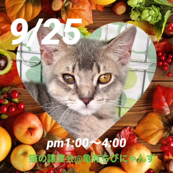| イベント内容 | 猫の里親会@亀有ちびにゃんず 9月25日(日) 東京葛飾区亀有3-21-12 カルチャースペースあい 13:00 ~ 16:00 手の消毒剤、検温機あり マスク着用、 体調のすぐれない方は見学をご遠慮下さい。 ご質問大歓迎です。 分からない事など何でも聞いて下さい。 生涯家族の一員としてたっぷり愛情を注いでくださるご家庭をお待ちしております。 ご状況によりご希望に添えない場合もございますのでご了承下さい。 【以下の方には譲渡しておりません】 ・猫の飼育が許可されていない住居にお住まいの方 ・未成年者、友人同士&同棲でお住まいの方、乳児のいるご家庭、妊娠中の方、 ・60歳以上の方への子猫譲渡 ・脱走防止対策にご協力頂けない方 ・経済的に不安定な方(休職中、就職活動中、アルバイト等) ・仔猫の場合は留守番の多いご家庭 ・住居の構造を聞かせていただく事があります。(階下への騒音など) ・犬猫を4頭以上飼育している方 他、飼育に適切でないと判断した場合や個体により条件が違う場合があります。 【当里親会は猫さんと里親様とのマッチングを大切にしています】 はじめて猫さんをお迎えする場合に適した猫さん、お留守番の長い里親さんに適した猫さん等、お迎えする不安など経験豊富なスタッフがお話を聞き、アドバイスさせていただいています。 お気軽にお声をかけてください。 【ご負担頂く費用について】 譲渡の際に活動協力金を里親様にご負担頂く事により飼い主のいない猫の継続的治療や保護、新しいご家族の元へ送り出す事ができます。 ご理解とご協力をお願い致します。 ◆活動協力金(譲渡費用)のご負担がございます。 ★仔猫・成猫 1頭20.000 ワクチン・ウイルスチェック・駆虫が済んでいます。 成猫は不妊去勢手術済が済んでいます。 ★猫をお届けする時の交通費をいただいております。 1500〜実費 【譲渡の条件がございます】 ①終生飼育 ②完全室内飼育 ③未手術子猫は適正時期の不妊・去勢手術 ④譲渡負担金 ⑤身分証提示&契約書の署名捺印 ⑥定期報告義務(トライアル中こまめに、譲渡後1.3.6ケ月、1年に一度 ⑦二次譲渡の禁止 以上をご了承ください。 トライアル期間は全ての猫さんに設けております。 トライアル期間を経て初めて正式譲渡となります /////////////////////////////////////// https://twitter.com/shosukereiko 【里親さん募集中の猫~猫の里親をさがす会別館】 http://behappynyans.blog.fc2.com/blog-entry-13.html 【猫の里親をさがす会】 https://blog.goo.ne.jp/bobton |