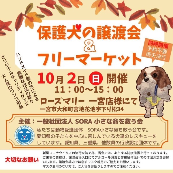 | イベント内容 | フリーマーケットと同時に保護犬の譲渡会を開催します。 なお、新型コロナウィルス感染拡大の状況におきまして、中止させていただくこともございますのでご了承下さい。 事前のお申込みは不要です。保護活動ブログで、開催日の数日前に譲渡会参加が決定したワンコたちのご案内もしておりますので、ご希望のワンコの参加をご確認してお越し頂けますと幸いです。 SORA公式ホームページ https://sora-chiisana.org/foster/ SORA公式活動メインブログ https://ameblo.jp/sora-chiisana-inochi/ SORAイベントブログ https://ameblo.jp/sora-charity-events/ |