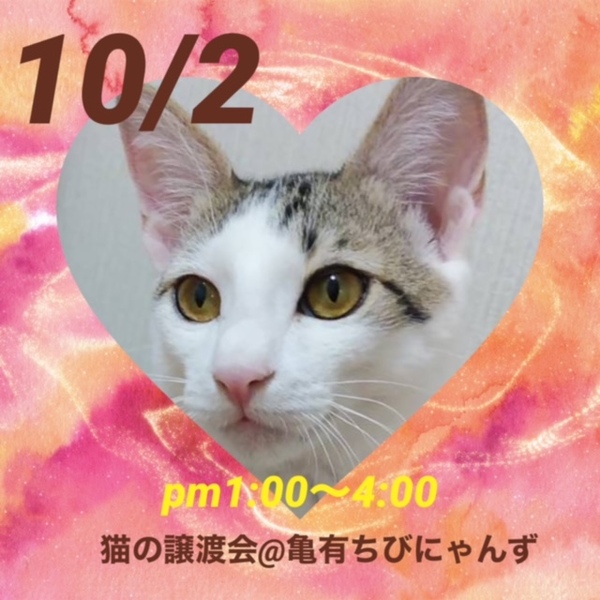 | イベント内容 | 猫の里親会@亀有ちびにゃんず 10月2日(日) 東京葛飾区亀有3-32-18 住友生命ビル前 13:00 ~ 16:00 手の消毒剤、検温機あり マスク着用、 体調のすぐれない方は見学をご遠慮下さい。 ご質問大歓迎です。 分からない事など何でも聞いて下さい。 生涯家族の一員としてたっぷり愛情を注いでくださるご家庭をお待ちしております。 ご状況によりご希望に添えない場合もございますのでご了承下さい。 【以下の方には譲渡しておりません】 ・猫の飼育が許可されていない住居にお住まいの方 ・未成年者、友人同士&同棲でお住まいの方、乳児のいるご家庭、妊娠中の方、 ・60歳以上の方への子猫譲渡 ・脱走防止対策にご協力頂けない方 ・経済的に不安定な方(休職中、就職活動中、アルバイト等) ・仔猫の場合は留守番の多いご家庭 ・住居の構造を聞かせていただく事があります。(階下への騒音など) ・犬猫を4頭以上飼育している方 他、飼育に適切でないと判断した場合や個体により条件が違う場合があります。 【当里親会は猫さんと里親様とのマッチングを大切にしています】 はじめて猫さんをお迎えする場合に適した猫さん、お留守番の長い里親さんに適した猫さん等、お迎えする不安など経験豊富なスタッフがお話を聞き、アドバイスさせていただいています。 お気軽にお声をかけてください。 【ご負担頂く費用について】 譲渡の際に活動協力金を里親様にご負担頂く事により飼い主のいない猫の継続的治療や保護、新しいご家族の元へ送り出す事ができます。 ご理解とご協力をお願い致します。 ◆活動協力金(譲渡費用)のご負担がございます。 ★仔猫・成猫 1頭20.000~25000 ワクチン・ウイルスチェック・駆虫が済んでいます。 成猫は不妊去勢手術済が済んでいます。 ★猫をお届けする時の交通費をいただいております。 1500〜実費 【譲渡の条件がございます】 ①終生飼育 ②完全室内飼育 ③未手術子猫は適正時期の不妊・去勢手術 ④譲渡負担金 ⑤身分証提示&契約書の署名捺印 ⑥定期報告義務(トライアル中こまめに、譲渡後1.3.6ケ月、1年に一度 ⑦二次譲渡の禁止 以上をご了承ください。 トライアル期間は全ての猫さんに設けております。 トライアル期間を経て初めて正式譲渡となります /////////////////////////////////////// https://twitter.com/shosukereiko 【里親さん募集中の猫~猫の里親をさがす会別館】 http://behappynyans.blog.fc2.com/blog-entry-13.html 【猫の里親をさがす会】 https://blog.goo.ne.jp/bobton |