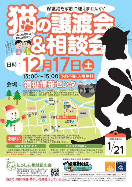 | イベント内容 | 12月17日(土)に「猫の譲渡会」を開催いたします。 猫少なめのミニ譲渡会&相談会です。 年末年始の長いおやすみは、新しいおうちにドキドキしている猫さんとゆったりと過ごせる絶好のチャンス(^^)/ ご近所との猫トラブルなどでお悩みの方もお気軽にお立ち寄りください。 お待ちしております! 【日時】2022年12月17日(土)13:00〜15:00 【会場】福祉情報センター(中央福祉センターとなり) 【主催】にっしん地域猫の会 【ホームページ】http://nissinchiikineko.main.jp ※入場無料・予約不要です。 ※緊急事態宣言中は開催中止となります。また、感染症拡大防止のため、入場に際して制約がございますので、ご理解・ご協力をお願いいたします。詳細は、ホームページにて随時更新いたします。 ※会場前に駐車場がございますが、数が少ないため、満車の場合は中央福祉センターか日進市役所の駐車場をご利用ください。図書館向かいにも市役所の臨時駐車場がございます。 ※ペット同伴のご入場はできませんので、予めご了承ください。 ※感染症拡大防止対策として、室外でお待ちいただく場合や室内換気のため冷暖房が効きにくいことがございます。 ※猫ちゃんの譲渡には条件がございます。詳細はホームページをご参照ください。 |