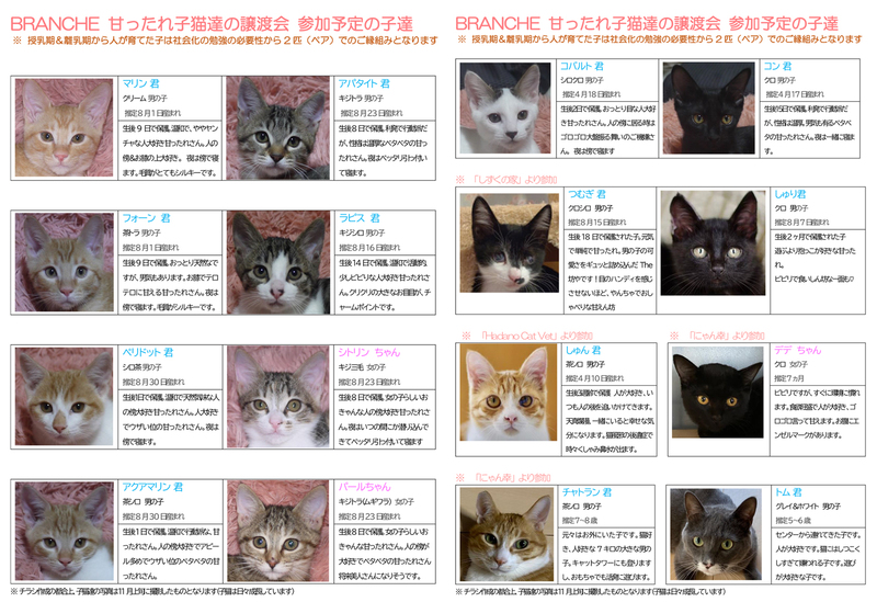 | イベント内容 | Branche 甘ったれ子猫譲渡会 授乳期から人が育養したベタベタの甘ったれな子猫達と 人慣れ抜群、人大好きな成猫達の譲渡会です。 予防接種を終えた2ヵ月~6ヶ月の子猫達13匹と成猫2匹が参加します。 日時:12月4日(日)午後12時~午後16時(入場15時30分迄) 会場:BRANCH(ブランチ)茅ヶ崎店3号館2階 ペットフォレスト湘南茅ヶ崎店内 場所:神奈川県茅ケ崎市浜見平10番2号ブランチ3号館 2階 当日、マラソンが開催されるので、海岸線の交通規制があるそうです。 付近も渋滞の影響があるかと思いますので、余裕を持ってお越し頂ければと思います。 |