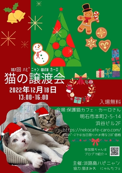 | イベント内容 | 猫の譲渡会 日時:12月17日(日)13時から16時まで 場所:明石市本町2-5-14 浜谷ビル2階 保護猫カフェ・カーロ (お問合せはカーロさんにしないようにお願いします) ★お車の方は近隣にコインパーキングがたくさんありますので ご駐車お願いします 子猫がたくさん参加しています♪ 本気で猫を飼いたい方是非ご来場ください 早い順ではございませんが早くに決まってしまう場合がございますので お早めにお越しいただくか面会予約をお願いします ※無料ではありません ※当日連れて帰れません ※譲渡条件があります ●参加猫たちのお紹介やお問い合わせ(面会予約等)は ブログよりご連絡お願いします https://ameblo.jp/wan--love--nyan/ 主催:ハピニャン |