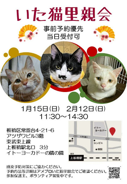 | イベント内容 | 「いた猫里親会」は行き場のない猫ちゃんと里親様との 出逢いの場として板橋区で月に1度開催して1年がたちました♪ まだまだ至らないところもたくさんあるかとは思いますが 1匹でも多くのしあわせにゃんこが生まれますよう みなさまのご来場を保護主、スタッフ一同心よりお待ちしております♪ 開催にあたり感染防止対策として下記をお守り頂きます。 1.マスク着用 2.入場時の消毒 3.事前予約優先での入場 4. 当日受け付けは13時まで 予約を希望される希望者様は下記のメールアドレスまでお申し込み願います。 marutotokiwa@gmail.com ※当日、猫ちゃんを連れて帰ることは出来ません。 後日調整のうえ保護主が里親様宅へお届けいたします。 ◆開催日/開催時間◆ 2023年1月15(日) 11:30~14:30 ◆会場◆ 東京都板橋区常磐台4-21-6 アツザワビル3階 ※イトーヨーカドーの隣の隣 ◆交通手段◆ 東武東上線 上板橋駅北口 徒歩3分 ※お車でご来場の際、駐車場のご用意はございません。 近隣のコインパーキング等をご利用ください。 イトーヨーカドー裏に大きなコインパーキングがあります。 いつ里の掲載参加猫一覧はこちらから https://satoya-boshu.net/foster/?@button_name@=search&FosterParent_MemberID=54919 ◆いた猫里親会では猫ちゃんと里親様のスキンシップを大切にしています◆ 新しい家族として20年以上いっしょに暮らしていく猫ちゃんです。 里親会場でたくさんの猫ちゃんと触れ合って良きパートナーを見つけてください。 はじめて猫ちゃんを迎える不安や先住猫ちゃんとのトライアルの注意点 猫ちゃんと里親様の暮らし方など気軽にご相談ください。 経験豊富な保護主や猫大好きスタッフがアドバイスさせていただきます。 ◆子猫ご希望の里親様◆ 子猫は急な下痢や発熱等により体調が急変し、数時間対応ができなかっただけでも命を落とす事があります。 その為、当譲渡会では月齢によりお留守番のない又は少ないご家庭への譲渡に限らせて頂いております。 また里親様と子猫ちゃんが安心してトライアル期間を過ごせるよう体重が1㎏程になってからのお届けとさせて頂いております。 ◆里親希望のみなさまへ◆ ご家族の皆様で生涯、家族の一員としてたっぷり愛情を注いでくださるご家庭をお待ちしております。 下記に該当する希望者様へ ・独身、単身者の方 ・友人同士、同棲でのお住まいの方 ・高齢者のみのご家庭の方 は、ご相談の上、譲渡を判断させて頂きます ・適正飼育の不可能な方 ・脱走防止対策を検討して頂けない方 ・定期報告の不可能な方 は、ご遠慮下さいますようお願い致します ◆ご負担頂く費用について◆ 譲渡の際に譲渡負担金(医療費の一部、譲渡金、お届け時の交通費)を里親様にご負担頂く事により 過酷な状況にいる猫ちゃんを保護し新しいご家族の元へ送り出す事ができています。 皆様のご理解とご協力にボランティア一同、心より感謝しております。 猫のあしあとアメーバブログ https://ameblo.jp/nekonoasiato280/ メールでのお問い合わせ marutotokiwa@gmail.com |