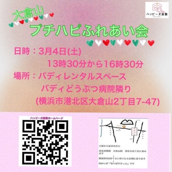 | イベント内容 | ご予約は必要ありませんが、ご来場の際の感染対策をお願いいたします。 (短時間の滞在時間となります) また、ワンコをお連れの場合は、紙オムツまたはマナーベルトの着用をお願いいたします。 ※新型コロナウイルスの感染状況により中止になる場合もございます。 しのママ、恋ママ、ぽえママのブログやインスタでご確認のうえご来場くださいませ。 色々とお願いごとばかりですが、よろしくお願いいたします。 日時: 2023年2月4日(土)13時30分から16時30分 場所: バディ動物病院隣り(横浜市港北区大倉山2-7-47(105) ※お越しいただく前に「ハッピー犬屋敷の里親の条件」をお読みいただきますよう、お願いいたします。 プチふれあい会は、預かりママや在校生のわんことじっくり話したり触れ合うことができますよ♪ 横浜方面のみなさま、どうぞ足をお運びくださいませ。 ★参加予定ワンコはハッピー犬屋敷ホームページの下記からご確認くださいませ。 ↓ |