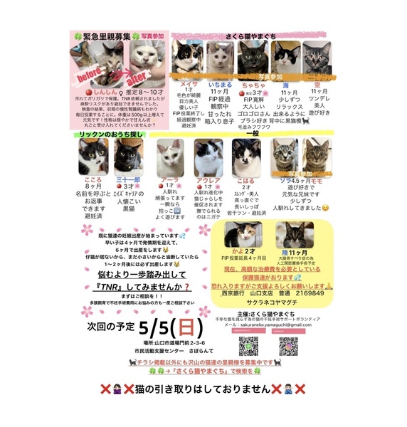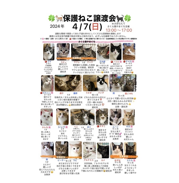 | イベント内容 | ★今回は時間変更【13時から17時まで】 山口市の『さぽらんて』で「保護ねこ譲渡会inさぽらんて」(さくら猫やまぐち主催、個人ボランティア合同開催)が開催されます。 猫ちゃん達は写真で見るより実際に見てもらった方が可愛いと思います。 ぜひ足をお運びいただいて、運命の子との出会いを見つけてください。 *譲渡には条件がありますので、気になる子がいましたらお問い合わせください。 *参加予定ねこちゃんは当日変更になる場合があります。 *チャリティーバザーもあります。 事前のお問い合わせも歓迎します。 リックンのおうち探し harry0930jp@yahoo.co.jp |