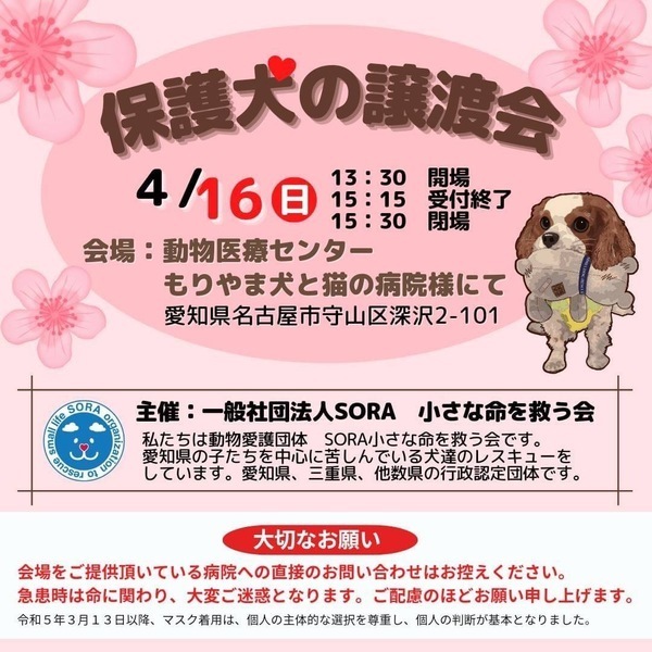 | イベント内容 | 保護犬の譲渡会を開催致します。 【注意】会場をご提供頂いている病院への直接のお問い合わせはお控えください。 急患時は命に関わり、大変ご迷惑となります。 ご配慮のほどお願い申し上げます。 もりやま犬と猫の病院さま 2階会議室 〒463-0811 名古屋市守山区深沢2-101 《ご注意》 家族希望ワンコがいる場合のお見合いに限定させていただきます。 事前のお申込みは不要です。保護活動ブログで、開催日の数日前に譲渡会参加が決定したワンコたちのご案内もしておりますので、ご希望のワンコの参加をご確認してお越し頂けますと幸いです。 なお、新型コロナウィルス感染拡大の状況におきまして、中止させていただくこともございますのでご了承下さい。 SORA公式ホームページ https://sora-chiisana.org/foster/ SORA公式活動メインブログ https://ameblo.jp/sora-chiisana-inochi/ SORAイベントブログ https://ameblo.jp/sora-charity-events/ |