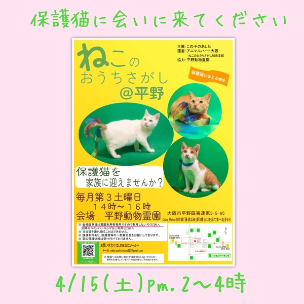 | イベント内容 | ねこのおうちさがし@平野 開催日 : 毎月第3土曜日 (次回4/15) 時間 : 午後2時~4時 場所 : 平野動物霊園 大阪府大阪市平野区喜連東3-5-65 Oaka Metro谷町線「喜連瓜破」駅、3番出口を出て東へ徒歩約9分 ☆会場へのお問い合わせは固くお断りします。 ☆平野動物霊園様の駐車場は霊園へのお参りのお客様専用ですので駐車しないでください。 保護猫里親会にお車でお越しの方は近隣のコインパーキングをご利用ください。 ※感染拡大の状況によっては急遽中止となる場合もございます。 ☆里親希望申込は先着順ではありません☆ 里親会終了後に検討させていただきますので、分散してご見学くださいますようご協力お願いします。 ★譲渡には完全室内飼育、同意書への署名・捺印などの条件、医療費等の一部負担があります。 ★猫さんは、後日お届けとなります。 当日連れて帰ることはできません。 ★参加予定の猫さんは、里親会の前に里親さまが決定する場合や、体調により不参加となる場合があります。 主催: この子のあした 運営: アニマルハート大阪 ねこのおうちさがし和泉支部 協力: 平野動物霊園 参加猫紹介ブログ https://ameblo.jp/konoasu222/ |