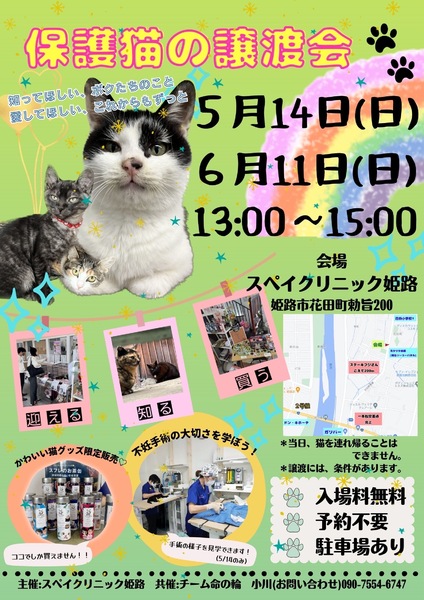 | イベント内容 | 第2回 保護猫の譲渡会@スペイクリニック姫路 チーム命の輪さんとの共催で行います。 姫路市花田町にあるスペイクリニック姫路にて 保護猫譲渡会を開催いたします。 参加猫ちゃんは、子猫から大人猫まで! たくさんの保護猫ちゃんが新しい家族を待っています。 可愛い猫グッズの販売もしています。 お買い物だけでもぜひお立ち寄りください。 *当日、猫を連れて帰ることはできません *譲渡には条件があります *譲渡会は猫ファーストです。 大きな声や猫の負担になる行為は 控えていただけますようお願いいたします。 |