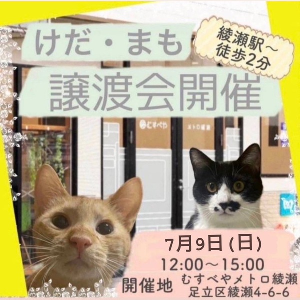 | イベント内容 | 家族を待ってる可愛い保護猫ちゃんが沢山参加します♪ チャリティー販売もやってます! 予約不要なのでお気軽に会場にお越しください。 日時:7月9日㈰ 12:00〜15:00 場所:むすべやメトロ綾瀬 東京都足立区綾瀬4-6-6 (JR常磐線 綾瀬駅から徒歩2分) ※お車は近隣のパーキングをご利用下さい。 お問い合わせ先 メール kedamamo2021@gmail.com 皆様のご来場お待ちしてます! |