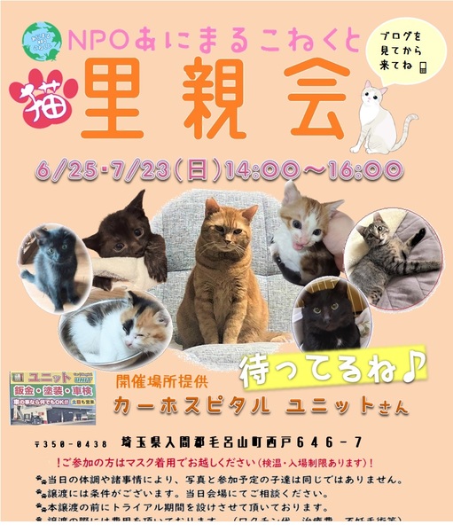 | イベント内容 | 子猫から成猫まで参加します!今回は、黒猫が多め・・・かも?? 黒猫好きさん集まれ~~♡ グッズ販売もあります♪ ※先着順ではなく里親会後に協議してより良い条件のご家族を選定させて頂いておりますので、お時間早い方が有利という事はありません^^ |