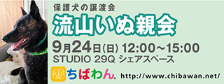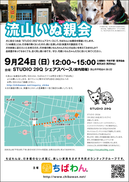 | イベント内容 | “STUDIO 29Q”にて第20回 流山いぬ親会を開催いたします。 飼い主探しをしている保護犬達に会いにきてみませんか。 ※いぬ親会見学は予約等必要ありません。無料でどなたでも入場できます。ただし、混雑を避けるために入場制限をさせていただく場合があります。 ※ネットによる募集も平行して行っているため、参加予定の犬が当日までに決定・不参加となる場合もあります。 ※イベントバナーに写真が掲載されている犬が参加するとは限りません。参加犬は本サイトに順次掲載されますのでそちらをご確認ください。 開催日:9月24日(日)12:00~15:00 室内開催:雨天決行 (荒天中止) 場所:STUDIO 29Q シェアスペース(2階) 千葉県流山市平和台4-36-22 【会場アクセス】 流鉄流山線「平和台駅」下車。踏切を渡り200m程直進、左側交差点角。駅より徒歩約3分。 駐車場はございません。当日お車の方は近隣のコインパーキングをご利用ください。 【注意事項】 《ご来場される皆様へのお願い》 臆病な性格の犬や、子供さんを苦手とする犬も参加しています。いきなり触ったりせず、まずボランティアに声をかけてください。 お子様と一緒にご来場される際には、手を繋ぐなどして頂き、お子様だけで参加犬に近づくことのないようご注意ください。 ※会場に同伴される犬には、必ずリード(引き綱)をつけてください。 【お知らせ】 ◆会場ではチャリティグッズを販売します 【お問い合わせ】 いぬ親会について:https://chibawan.net/inquiry_chiba ※いぬ親会当日はメールが見れません。また、お問い合わせの際は、必ず「具体的な件名」を入れて多数の迷惑メールと区別がつくようにお願いいたします。 流山いぬ親会イベントホームページ https://chibawan.net/event/20230924-nagareyama-dog ちばわんホームページ https://chibawan.net/ |