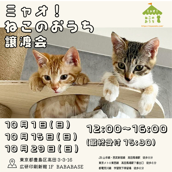 | イベント内容 | 参加する保護猫ちゃんはホームページが最速で更新されます。 およそ譲渡会一週間程前よりホームページにてご確認いただけます。 https://myaoneko.com/cats/ 事前予約はできません。 猫ちゃんをお世話することになるご家族皆様でお越しくださると嬉しいです。 譲渡会場でお会いしましょう♪ 会場にて、以下の点をお願いをしております。 ✿手指消毒 ✿連絡先のご記入 新型コロナウイルスおよび猫さん感染症対策のため、猫さんと触れ合う際には手指消毒をお願いしております。 御来場者多数の場合には入場制限を設けさせていただきます。 ※当日沢山のご来場者様がいらっしゃった場合、整理券をお渡しする事がございます。 会場内外で長時間お待たせする場合もございますが、ご理解くださいますようお願い致します。 結果のご連絡は、当日夜〜翌日夜までの間に、お電話もしくはメールにて保護主より直接ご連絡いたします。 ◇譲渡に関してのお願い 【ミャオ!ねこのおうち】では譲渡に際して、以下の要件をお願いしております。 ・完全室内飼いで終生愛育 ・脱走させないための対策 ・不妊去勢手術 ・譲渡誓約書の取り交わし ・医療費の一部ご負担 ※60才以上の方のみのご家庭、独身や、経済的に困難な世帯、 必要な脱走対策を施していただけない方には原則的に譲渡はご遠慮頂いております。 また、保護主により譲渡条件が異なる場合もございますので会場でご相談ください。 参加予定ねこちゃんは、急な体調不良などで不参加になる場合もございます。 【譲渡に関してのお願い】・【医療費の一部のご負担】・【譲渡までの流れ】など 詳しくは下記ホームページをご覧くださいますよう宜しくお願い致します。 ミャオ!ねこのおうち ホームページ https://myaoneko.com |
