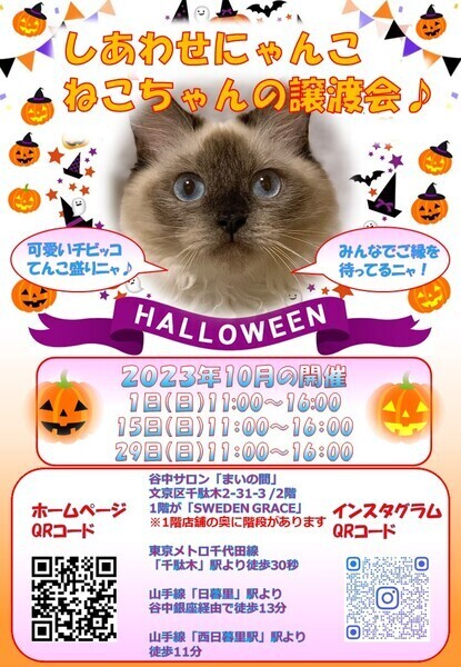 | イベント内容 | 「しあわせにゃんこ」は行き場のない猫ちゃんと里親様との 出逢いの場を提供するグループです♪ 子猫も成猫もハンデのある猫もみんな新しい家族を待っています♪ みなさまのご来場を保護主、スタッフ一同心よりお待ちしております♪ 開催にあたり感染対策として各種制限等を設けております。 ※詳しくはホームページ譲渡会情報をご確認願います。 http://www.shiawasenyanko.net 食欲の秋でもなく紅葉の秋でもなくにゃんこの秋です! ご縁を待っているにゃんこと皆様のご来場をお待ちしております♪ ◆開催日/開催時間◆ 2023年10月1日(日) 11:00~15:30 ※会場都合によりいつもより30分早く終了しますのでご注意下さい! ご希望の猫ちゃんがいらっしゃる場合は11時30分までに受付をお願い致します。 複数のお申し込みがある場合は11時30分で受付を終了させて頂く場合がございます。 受付をされた全ての里親様とお見合いをさせて頂きます。 ※先着順ではございません。 ※当日、猫ちゃんを連れて帰ることは出来ません。 後日調整のうえ保護主が里親様宅へお届けいたします。 ◆会場◆ 受付はまいの間1階です♪ 直接会場までお越し下さい♪ 譲渡会場:東京都文京区千駄木2-31-3 1階が北欧雑貨ショップ「SWEDENGRACE」 2階が谷中サロン「まいの間」 ※詳しいアクセスはホームページをご覧下さい http://www.shiawasenyanko.net 谷中サロン「まいの間」の情報はこちら http://neko-to-kyo.com/#maima ◆交通手段◆ 東京メトロ千代田線「千駄木」駅より徒30秒 JR山手線「西日暮里」駅より徒歩11分 JR山手線「日暮里」駅より谷中銀座経由で徒歩13分 ※お車でご来場の際、駐車場のご用意はございません。 近隣のコインパーキング等をご利用ください。※近隣に沢山あります。 いつ里の掲載参加猫一覧はこちらから https://satoya-boshu.net/mypage/foster_list.php?@ps@=none アメーバブログの里親募集にゃんこはこちら https://ameblo.jp/shiawasenyan-ko/theme-10092719565.html ◆猫ちゃんとのお見合い◆ 掲載している猫ちゃんは基本的に譲渡会場でのお見合いのみとなります。 譲渡会への参加が決定している猫ちゃんはその譲渡会で里親様が決定しなかった場合のみ保護主宅でのお見合いが可能となります。 自宅お見合いを希望される里親様はメール(info@shiawasenyanko.net)にてご相談ください。 ◆当譲渡会では猫ちゃんと里親様のスキンシップを大切にしています◆ 新しい家族として20年以上いっしょに暮らしていく猫ちゃんです。 譲渡会場でたくさんの猫ちゃんと触れ合って良きパートナーを見つけてください。 はじめて猫ちゃんを迎える不安や先住猫ちゃんとのトライアルの注意点、猫ちゃんと里親様の暮らし方など気軽にご相談ください。 経験豊富な保護主や猫大好きスタッフがアドバイスさせていただきます。 ◆子猫ご希望の里親様◆ 子猫は急な下痢や発熱等により体調が急変し、数時間対応ができなかっただけでも命を落とす事があります。 その為、当譲渡会では月齢によりお留守番のない又は少ないご家庭への譲渡に限らせて頂いております。 また里親様と子猫ちゃんが安心してトライアル期間を過ごせるよう体重が1㎏程になってからのお届けとさせて頂いております。 ◆里親希望のみなさまへ◆ ご家族の皆様で生涯、家族の一員としてたっぷり愛情を注いでくださるご家庭をお待ちしております。 下記に該当する希望者様へ ・独身、単身者の方 ・友人同士、同棲でのお住まいの方 ・高齢者のみのご家庭の方 は、ご相談の上、譲渡を判断させて頂きます ・適正飼育の不可能な方 ・脱走防止対策を考えて頂けない方 ・定期報告の不可能な方 は、ご遠慮下さいますようお願い致します ◆ご負担頂く費用について◆ 譲渡の際に譲渡負担金(医療費の一部、譲渡金、お届け時の交通費)を里親様にご負担頂く事により 過酷な状況にいる猫ちゃんを保護し新しいご家族の元へ送り出す事ができています。 皆様のご理解とご協力にボランティア一同、心より感謝しております。 ご負担頂く医療費につきましてはホームページに詳しく記載させて頂いております。 http://www.shiawasenyanko.net/onegai.html しあわせにゃんこホームページ http://www.shiawasenyanko.net メールでのお問い合わせ info@shiawasenyanko.net |