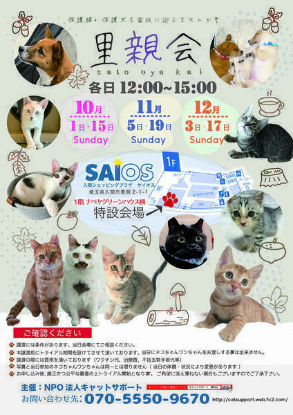 | イベント内容 | ◎12月17日 ※猫ちゃん・ワンちゃんの体調・天候により時間変更・中止になる場合が御座います。 ※当日に猫ちゃん・ワンちゃんをお渡しする事は出来ません。譲渡には条件があり、詳細は当日会場にてご相談ください。 |