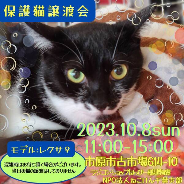 | イベント内容 | 今年生まれの子猫から大人猫まで、沢山の保護猫達が譲渡会に参加します♪ ブログにて、譲渡会に参加する猫さん達を紹介しております。 ねこけん千葉支部ブログ→ https://ameblo.jp/nekoken-chiba/ 通常スタイルの譲渡会と致しますが、コロナウイルス対策として ・会場内ではマスクのご着用と入退室の際は消毒をお願い致します。 ・ご予約無しでお越しいただけますが、混雑時は整理券を配らせていただきます。 ご協力の程よろしくお願い致します。 また、譲渡会会場では、千葉県内にお住いの預かりボランティアさん及びお世話ボランティアさんを募集しています。 ご希望の方は、大変お手数をおかけしますが、譲渡会までお越しください。 ※ご都合がつかない場合は、お問い合わせ先までご相談ください。 [日時] 10月8日(日)11:00~15:00 [会場] 千葉県市原市古市場614-10 ※屋内での開催となり雨天決行です。 ※抱っこもOK! ※猫ちゃんの負担も考え、ご来場は時間内にお願い致します。 ※特にご予約などは必要ございませんのでご家族皆様でぜひお越し下さい。 ※駐車場あり。 [交通] 交通機関を利用してお越しの方 JR内房線 浜野駅より徒歩13分 浜野駅は、東京駅から京葉線→内房線でおよそ50分の距離!! お車でお越しの方 京葉道路蘇我インターより車で10分 ※駐車場はラジコンショップハッピー様裏手にございます駐車場をご利用ください [譲渡ご希望の方へのお願い] 誠に恐れ入りますが下記に当てはまります方への譲渡は不可となりますので予めご了承下さい。 ①学生さん、未成年の方、安定収入のない方 ②ペットを飼う事を許されていない住宅にお住まいの方 ③身体的、精神的疾病で治療中の方 ※60歳以上の方は別途条件がございますのでご相談下さい。 [譲渡の流れ] お申込み→審査→後日お届け→トライアル→正式譲渡 ※当日のお連れ帰りは出来ませんので予めご了承ください。 ※仮譲渡時にご希望の猫ちゃんにかかった医療費(血液検査・ワクチン・駆虫・不妊去勢手術等)をご負担願います。 しかし、正式譲渡に至らなかった場合は医療費を全額返済致します。 [主催] 動物愛護団体 NPO法人ねこけん 千葉支部 [ブログ] https://ameblo.jp/nekoken-chiba/ [参加動物] 成猫・子猫(ねこけん保護猫以外の猫ちゃんも参加予定です) [お問い合わせ] ご不明な点、ご質問等ございましたら下記までお問い合わせください。 chiba.info@nekoken.jp |