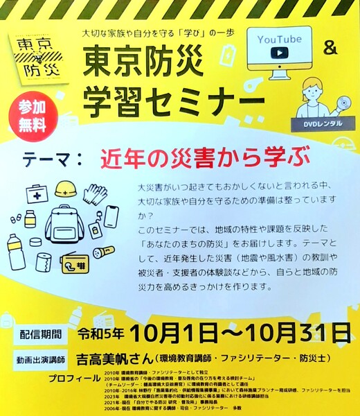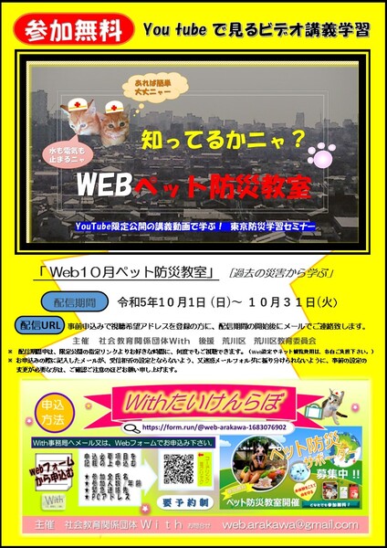 | イベント内容 | 参加無料でいつでもどなたでも、配信期間ネット視聴できます ~ペットと備える防災無料講座~ どなたでも参加可能&事前申込み制 詳細はこちら▼ 荒川区HPhttps://www.city.arakawa.tokyo.jp/a032/pet/pettobousai.html?s=03 【視聴期間】令和5年10月1日 (日)~ 31日(火) 内容 「10月Webペット防災教室」講義は、東京防災学習セミナー講師より、過去の災害から、近年のマンション防災やペットを飼育する方の注意する備えなど、最新のくらしの防災課題を踏まえた備えをビデオ講義で学びます。 申込み オンラインビデオ講義による防災教室参加希望の方は、下記メール、又はオンラインフォームにアクセスし、お申込みをお願いいたします。 ◎ 申込み締切〆は10月 22日24時 申込みフォームURL:https://form.run/@web-arakawa-1683076902 申込み必要事項)①氏名②緊急連絡先③PCメールアドレスをご記入の上お申し込みください。 ※ 視聴URLは、参加者募集締め切り後、参加希望者へ参加の受付確認完了メール後に、各防災教室の指定の期間が開始された後に、順次メールにご連絡いたします。 ※ お申込みの際に記入したメールが、Withからのメールを受信拒否の設定とならないよう、又迷惑メールフォルダに振り分けられないように、事前の設定の変更が必要な方は、ご確認ご注意のほどお願い申し上げます。 主催・申込み・問合せW i t h 舘山 電子メールアドレスweb.arakawa@gmail.com |