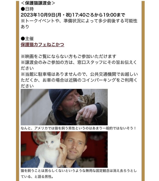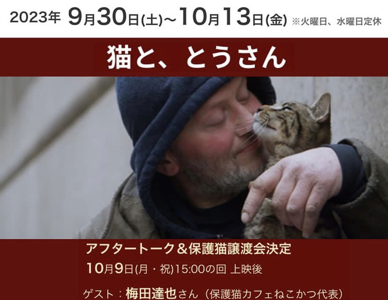 | イベント内容 | ★10/9(月祝):保護猫譲渡会&アフタートークin川越スカラ座 川越スカラ座様で猫好きさん必見のドキュメンタリー映画 『猫と、とうさん』が現在上映中です☆*:. 10月9日(月祝)の映画上映後、 ねこかつ代表のアフタートークと 保護猫譲渡会が行われます 猫好きさんならぜひ見たい映画とトーク、 譲渡会は珍しく夕方から映画館内で開催です 男性も女性もお子様も! 猫好きさん、里親希望さん、 皆様で川越スカラ座へお越しください! *°*°*°*°* ≪猫と、とうさん≫ 2020年、未曾有のパンデミックを愛猫と共に乗り越えた 9人の男性とその猫達の絆を描いたドキュメンタリー 俳優に消防士・路上での生活など、 それぞれ環境や背景が様々な男性達に共通しているのが、猫への愛情。 猫を大切にしながら今を生きる彼らと、 猫達との日々を爽やかに映し出しています。 ・期 間:9/30(土)〜10/13(金) ・上映館:川越スカラ座 (本川越駅徒歩15分/火・水休館) <アフタートーク> ・日 時:10/9(月祝)16時35分〜17時40分 (映画の上映は15時〜16時33分) ・ゲスト:梅田達也さん(保護猫カフェねこかつ代表) <保護猫譲渡会> ・日 時:10/9(月祝)17時40分〜19時 ・主 催:保護猫カフェねこかつ ※譲渡会のみのご参加も可能です |