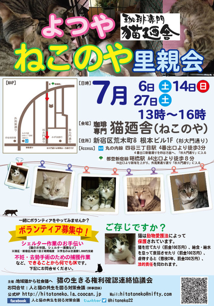| イベント内容 | FIPフリー:全頭FIP血液検査を実施。陽性の子と陰性の子は隔離、猫たちは最高の環境の中にいます。 コロナウィルス抗体価100未満陰性の子のみ里親会に参加。 また、お問い合せの前にお願い事項の確認をお願いします。 http://homepage2.nifty.com/hitotoneko/keiyaku.html 4箇月齢以下の子猫は、 2頭一組または同世代の先住子猫がいる方、 お留守番時間が8時間以下の方 に限ってお譲りします。 成猫については、お留守番時間についての制限は特にございません。 猫又は犬を4頭以上飼っている方にはお譲りできません。 55歳以上の方には、子猫はお譲り出来ません。 60歳の方は5歳、65歳の方なら10歳の成猫ならお譲りできます。 お試し期間は1週間です。 お申し込み時に、運転免許証、健康保険証など、 身分を保証する証明証の提示をお願いします。 猫が欲しい。猫を飼ってみたい。 猫に不妊・去勢手術を受けさせたい。 猫のボランティアをやってみたい その他、猫の相談よろず引き受けます。 一緒にボランティアをやってみませんか。会員募集中! 港区、新宿区のシェルターの猫のお世話係 週1回、2時間程度、時間帯は自由 学生には交通費として1000円を一律に支給します。 他に、TNRボランティア、搬送ボランティアなどを募集しています。 まずはお気軽に体験作業にお越し下さい。 主催 地域猫から社会猫へ・猫の生きる権利確認連絡協議会 電話 080-5437-2665 メールアドレス hitotoneko@ezweb.ne.jp ホームページ http://hitotoneko.la.coocan.jp |