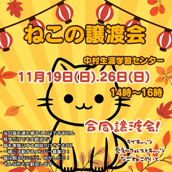 | イベント内容 | ねこの里親になりませんか? 日時 11月19日(日) 14時~16時 場所 中村生涯学習センター 名古屋市中村区鳥居通3-1-3 主催 ラブキャッツ 愛知フォレストキャッツ なごねこめいと 地域猫活動やTNR活動の過程などで 保護した猫たち 子猫もいれば、大人猫もいます この時期は3ヶ月〜8ヶ月程度の 子猫が多く参加します 見学、相談だけでも大丈夫! 予約不要、参加費無料なのでお気軽に 猫に関する活動を何かしたい、という方も歓迎です 遊びに来る感覚で、お越しくださいませ ☆猫に関して☆ 各団体の保護主さんごとに決めているお約束事があります ・当日は猫を連れ帰ることはできません ・猫を迎えるにあたり、飼育環境などについて お話しをさせていただきトライアル(お試し飼育) から始めさせていただきます ・2週間前後のトライアル期間を経て、問題ない ようであれば、譲渡契約書を結び正式譲渡と なります ・所定の譲渡費用をいただきます |