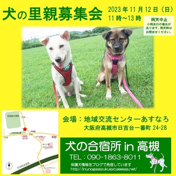 | イベント内容 | ※屋外会場での里親募集会です。雨天時は中止にする可能性がありますので電話またはブログでご確認ください。 (電話でのお問合せ→090-1863-8011) ※敷地内には駐車できません。近隣のパーキング等をご利用ください。 ※先住ワンちゃんを連れて会いに来て頂けます。隣の公園でお散歩して相性をみることもできますので、是非是非、連れてきてください。 ※小規模開催です。詳しくはブログの関連記事をご覧ください。 http://inunogassyukusyo.seesaa.net/article/501314504.html 予約不要ですが、参加犬が直前に変更する場合がありますので、特に会いたいワンちゃんが決まっている場合は事前にご連絡ください。 【お問合せ】 090-1863-8011 ・・・・・・・・・・ 市民ボランティア「犬の合宿所in高槻」は、譲渡が難しい離島の保健所収容犬を引き取り、関西で新しい飼い主探しをしています。 保護犬を家族として迎えることが文化として定着し、生体販売に伴う悲惨な繁殖犬の存在がなくなることを願っています。 ・・・・・・・・・・・・・・・・・・・・・・・・・・・・・ ★ 一時預かりさんや犬の搬送ボランティアさん、里親募集会の当日お手伝いの方など常時募集しています。 ★犬によっては個別お見合いできる場合があります。 里親募集会に参加できない方で個別お見合いをご希望の方は、預かりさんとの日程調整が必要ですので、電話でお問合せください。⇒090-1863-8011 |