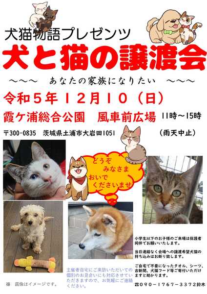 | イベント内容 | 毎月第二日曜日に土浦市の霞ヶ浦総合公園で開催しています、 犬と猫の譲渡会です。 毎回、色んなところからの家族を探す犬猫が参加します。 あなたとの出会いを待つワンニャンにぜひ会いにきてくださいませ。 11時~15時開催です ●犬猫物語は土浦を中心とし保護活動、野良猫の避妊去勢などを行っている団体です。 犬猫の相談などはお電話くださいませ。 譲渡会への猫の参加も受け付けております。 当日いきなりの参加は不可能ですが、事前にご連絡ください。 お待ちしています(^^ 問い合わせは09017673372鈴木まで。非通知には出ません。 #譲渡会 #里親会 #犬 #猫 #霞ヶ浦総合公園 #水郷公園 #犬猫物語 |