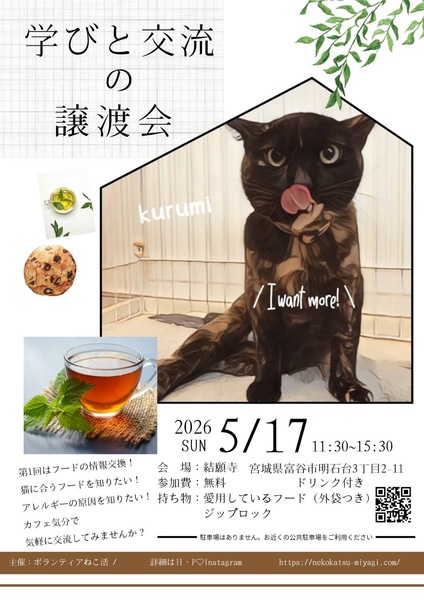 | イベント内容 | ★ハンドメイド雑貨販売 ★キラキラブレスレット ★保護猫カードでお見合い ⭐︎グッズの売り上げは全て保護猫に使われます。 ⭐︎入場料は無料です。 キッチンカー、ハンドメイド雑貨、パン、焼き菓子など楽しいマルシェです。 お誘い合わせの上ご来場下さい。 |