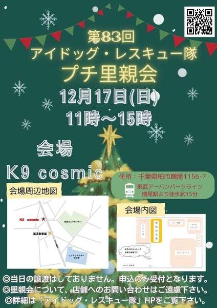 | イベント内容 | 第83回 アイドッグプチ里親会in柏のお知らせ ⭐️日時 12月17日(日) 一部 11:00~12:30 二部 13:00~14:30 ※完全入替制 ⭐️会場 K9 cosmic(ケーナインコズミック) https://k9cosmic.com/ 住所:千葉県柏市増尾1156-7 (旧セブンイレブン柏増尾店 跡地) 店内入口からお入りいただき、左手側のスペースで里親会を開催します。 ◎電車でお越しの方 東武アーバンパークライン「増尾駅」より徒歩約15分 ◎お車でお越しの方 常磐線 柏ICより 千葉市方面へ30分ほど ◎駐車場 第一、第ニ駐車場あり ⭐️お願い 11時から18時まで、ドッグカフェ&ドッグランが通常営業で行われます。 そのため第一駐車場(お店前)は、一般のお客様が優先的に駐車されます。 カフェのご利用がなく、犬連れではないご来場者様につきましては恐れ入りますが、南方面に1分ほど歩いた場所にある『第2駐車場』をご利用下さい。 (軽自動車3台、普通車1台ほど駐車可能/大きな看板あり) ※マスクの着用は自己責任にてご判断をお願いします。 〜皆様のお越しをお待ちしております〜 |