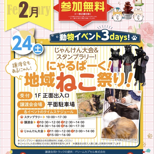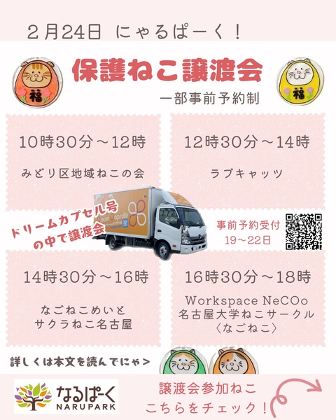 | イベント内容 | 2月24日(土) 【にゃるぱーく!地域ねこ祭り】 では、移動保護猫譲渡会も開催します なんと、ガチャガチャで有名なドリームカプセル株式会社さまに、ドリームカプセル号を提供していただきました! トラックの中で初めて開催される保護ねこ譲渡会です? 【開催時間】 10時30分〜12時00分 12時30分〜14時00分 14時30分〜16時00分 16時30分〜18時00分 ◆各回12家族/1家族4名様まで ◆1家族15分間 一部事前予約制となっております ⭐︎事前予約の方はチラシのQRコードを読み取るか、以下のリンクからご希望の時間帯をお選び下さい https://forms.gle/8V9PLZNu587QXkqW6 ⭐︎当日朝からも会場受付にて予約を受け付けます。 |