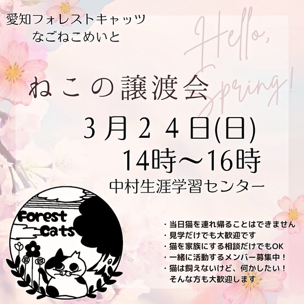 | イベント内容 | 保護猫の里親になりませんか? 日時 3月24日(日) 14時〜16時 場所 中村生涯学習センター 名古屋市中村区鳥居通3-1-3 主催 愛知フォレストキャッツwithなごねこめいと 地域猫活動やTNR活動の過程などで 保護した猫たち 子猫もいれば、大人猫もいます この時期は6〜10ヶ月程度の 子猫が多く参加します 見学、相談だけでも大丈夫! 予約不要、参加費無料なのでお気軽に 猫に関する活動を何かしたい、という方も歓迎です 遊びに来る感覚で、お越しくださいませ ☆猫に関して☆ 各団体の保護主さんごとに決めているお約束事があります ・当日は猫を連れ帰ることはできません ・猫を迎えるにあたり、飼育環境などについて お話しをさせていただきトライアル(お試し飼育) から始めさせていただきます ・2週間前後のトライアル期間を経て、問題ない ようであれば、譲渡契約書を結び正式譲渡と なります ・所定の譲渡費用をいただきます |