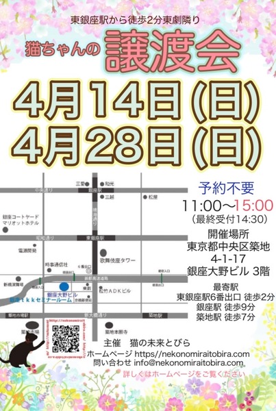 | イベント内容 | 東銀座で保護猫の譲渡会を開催しています「猫の未来とびら」です♪ 恵まれない環境にいる猫たちが未来へのとびらを開いて幸せなご縁に繋がる橋渡しをしていきます。 たくさんの猫ちゃんと保護主・スタッフ一同みなさまのご来場を心よりお待ちしています! 子猫ちゃん〜成猫ちゃんまで参加します♪ ※コロナ対策のマスク着用が緩和され, マスクを着用するかどうかは個人の判断となりましたが、 感染防止対策の上では、マスクは有効な手段です。 当会としましては、従来通りマスク着用をお願いしたいと思います※ 【ご来場いただく皆様には下記についてお願い致します】 ★不織布マスクの着用をお願い致します。 ★譲渡会場にお入り頂く前に手洗いと手の消毒をお願い致します。 ★熱のある方や体調の優れない方は譲渡会への来場を見合わせて頂けますよう、お願い致します。 ★来場者数によりましては人数制限もありますので長時間お待たせてする場合もございます。 予めご了承下さい。 コロナウイルス感染防止の為、大変恐縮ですが何卒ご理解とご協力、ご了承をいただけますようお願い致します。 ★☆★★☆★★☆★★☆★★☆★★☆★★☆★★☆★★☆★ ★開催日時 2024年4月14日(日) 11:00~15:00(最終受付 14:30) ★会場 東京都中央区築地4-1-17 銀座大野ビル 3階 (東劇となり) ★最寄駅 東銀座駅 6番出口 徒歩2分 銀座駅 徒歩9分 ・築地駅 徒歩7分 駐車場は当ビル又は近隣のコインパーキング等をご利用ください。 会場への直接のお問い合わせはご遠慮くださいませ。 ★☆★★☆★★☆★★☆★★☆★★☆★★☆★★☆★★☆★ 会場で猫ちゃんと触れ合ってご縁を繋いでください。 里親様・猫ちゃんが双方、幸せな家族になれるよう保護主・スタッフがサポート致します。 ご不安な事はお気軽にご相談ください。 入場無料です。事前のご予約は不要です。 当日猫ちゃんの引き渡しはございません。 後日、保護主が里親様宅へお届けいたします。 ※参加予定猫ちゃんは、急な体調不良等で不参加になる場合もございます。 開催当日の朝、当会ブログにて不参加の最新情報を掲載致しますのでご確認をお願い申し上げます。 ◇譲渡に関してのお願い・基本条件 1.家族の一員として終生最期まで愛育下さい。 2.完全室内飼い・ペット可のお住まい(契約書を拝見致します) 3.脱走防止対策 4.避妊・去勢手術 5.里親様のご自宅へのお届け 6.譲渡誓約書への署名捺印・身分証明書の提示 7.医療費譲渡金のご負担 8.定期報告 9.トライアル期間有り ※保護主により譲渡条件は異なりますので会場で直接ご相談ください。 60才以上の方のみのご家庭、未成年の方、単身の方、同棲中の方、 小学生低学年以下のお子様のいる方、必要な脱走対策を施していただけない方は譲渡をご遠慮頂く場合もございますのでご了承ください。 仔猫の場合は主にお世話される方のご年齢は55歳までとさせて頂きます。 オーバーする方はご相談くださいませ。 小さな子猫の譲渡は体重が1kgになってからのお届けやお留守番の無い(少ない)ご家庭を希望いたします。 医療費譲渡金に関しましては詳しくはホームページの 【譲渡に関してのお願い】【譲渡の流れ】をご覧くださいませ。 ~主催 猫の未来とびら~ |