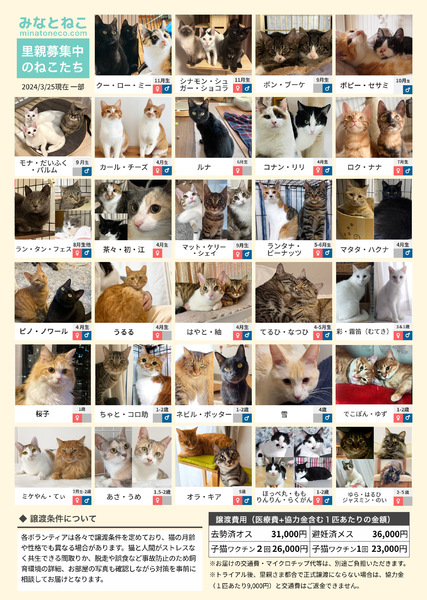 | イベント内容 | みなとねこが毎月定期開催している譲渡会です 2023年も譲渡会を通じて289匹もの猫を161家庭にご縁を繋ぐことができました 譲渡会にはご来場予約が必要です ご予約はみなとねこのHPよりお願いします https://www.minatoneco.com/event 参加猫の詳細はこちら https://www.minatoneco.com/gallery 参加猫たちの様子はYoutubeのみなとねこチャンネルもご覧ください https://youtube.com/playlist?list=PLRxhCqU-Dt77IaUtZCDeratPPI7Jek6ZL ーーー 会場は明るく開放的な雰囲気です Youtube「みなとねこ譲渡会に行ってみよう」 https://youtu.be/8Q4Gti1swQk 20ケージ 40匹ほどの参加となりますが、それ以外の預かり宅の猫もご紹介可能です 子猫は2匹ペアでの譲渡が原則です 初めての方こそ最初から2匹をお勧めしています また私たちボランティアは、ご縁のあった猫たちに終生里親様に愛されて幸せに安全に暮らして欲しいと願っています このため里親になっていただくにはいくつかの条件やお約束事があります。 ◆基本条件(猫それぞれ、保護主により異なります) ・ご家族全員が飼育に賛成であること ・ペット可物件での完全室内飼い、エアコンなどによる室温管理、医師の指示に従い定期的な受診やワクチン接種、 適切な時期(生後4ヶ月中)での避妊去勢、病気予防に配慮したフードの選択、終生飼養をお願いしております。 ・ケージのみの飼育、リビング以外の一室のみでの飼育は不可です。十分な運動のスペースと窓から景色が眺められのんびり日向ぼっこが可能な環境が望ましいと考えています。 ・誤食などの事故防止のため、お部屋の整理整頓や脱走防止にも万全の対策をお願いします。 ・換気が十分でない室内での喫煙をされる方はお断りしております。 ・日々のお世話だけでなく、スキンシップが可能な精神的・時間的・経済的な余裕がある方に限らせていただきます。猫が20年以上生きる中でなるべく変わらぬ環境で愛情を注いで頂けるよう、家族構成やお仕事、お住まいに変化のない方を優先させていただきます。 またお届けやフォローの都合上、募集エリアも東京、神奈川、埼玉に限らせていただいております。 ■里親申込書類一式はみなとねこHPよりダウンロードをお願いします https://www.minatoneco.com/foster-entry 会場では里親申込書を拝見して簡単な面談を行います 会場にてご記入いただくことも可能ですが、面談希望の方が多いとお待ちいただくことになりますので、お手元で印刷していただきご記入の上ご来場いただくことをおすすめしております ※ご家族にアレルギーがある方、喫煙者がいる場合には是非事前にご相談ください ※猫と暮らしたことのない未就学児がいらっしゃる場合には事前にアレルギー検査などお勧めします 実際の参加予定猫 4/20(土)21:00までにみなとねこのHPやFacebookページでご紹介します https://m.facebook.com/minatoneco/ 直接ご応募の方は詳細をLINEなどでやりとりの上で預かり宅でのお見合いも行っております そうした中で譲渡会前に里親様が決定することもございますことご了承ください ※予約優先、30分入替制、混雑時は入場をお待ちいただくなどのご協力をお願いしております ※換気のためにドアをオープンしての開催のためにケージ越しでのご対面となりますことご理解ください ※譲渡会の開催や保護活動の継続のため、お一人様500円以上のご寄付をお願いしております |