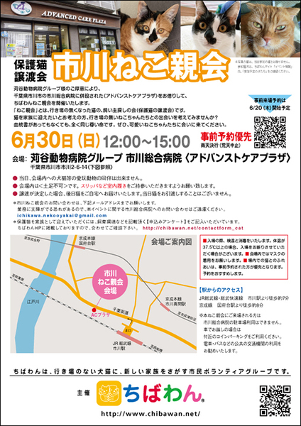 | イベント内容 | 苅谷動物病院様のご厚意により、千葉県市川市の市川総合病院にに併設された<アドバンストケアプラザ>をお借りして、「ちばわんねこ親会」を開催いたします。 是非カワイイねこたちに会いに来てください♪ ※場内テント内での猫とのふれあいは、事前予約優先とさせて頂きます。 ポスターのQRコード、または下記の「ちばわんねこ親会 ご来場予約フォーム」からご予約をお願いいたします。事前来場予約は6月20日(木)開始予定です。 ちばわんねこ親会 ご来場予約フォーム https://docs.google.com/forms/d/e/1FAIpQLSflPDIHZFu7Q0OnNaop8nJEU48FOyTpgtFEsTRGJkQgLT2KAA/closedform ※場内でのねことのふれあいは、事前予約された方が優先となります。ご予約をおすすめします。 ※会場は土足禁止です。室内履きをご持参ください。 |