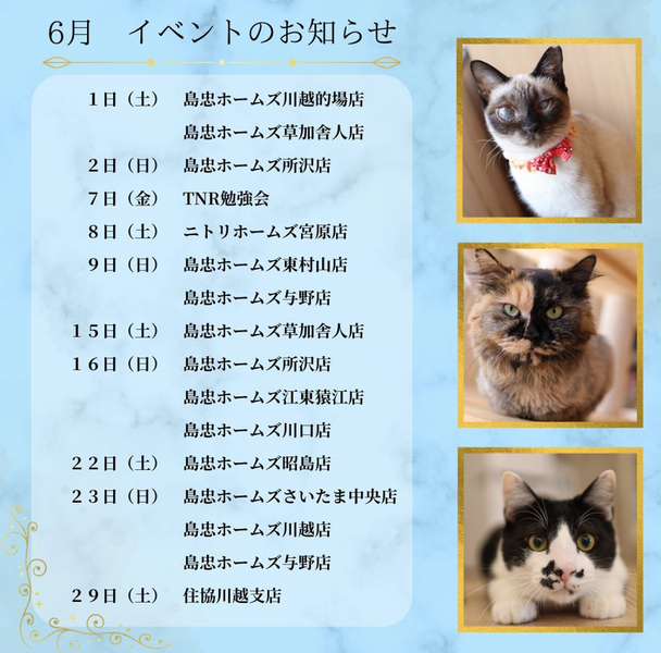 | イベント内容 | 保護猫カフェねこかつさん主催の保護猫譲渡会です☺︎ JR川越駅西口をでたら、徒歩6分 ショッピングモールのお隣が総合不動産建築の 『住協」様です ねこかつさんや個人ボランティアさんの元で大切にお世話された、ちびっ子や大人猫ちゃんがたくさん参加しますʚ₍ᐞ·͈༝·͈ᐞ₎ɞ どなた様もご自由にご参加いただけます*♪ 譲渡会ってどんなところかな? ちょっとみて見たい そんな方々も大歓迎です ❁譲渡には譲渡条件がございます ❁お申込みの際にはアンケートへのご記入がございます ❁当日に猫ちゃんを連れて帰ることはできません ※お車でお越しの際は近隣のコインパーキングをご利用ください |