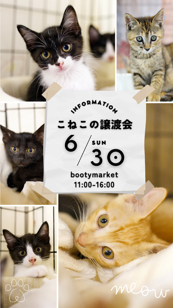| イベント内容 | 第5日曜日の6月30日! せっかくなのでこねこの譲渡会を開催してしまおう!と企画致しました。 最近仲間入りしたベラちゃん含めブーチー常駐組もいます! 通常開催の時間より一時間ずらしていますので16時までとなっております。 是非猫たちに会いに来てください♥ |